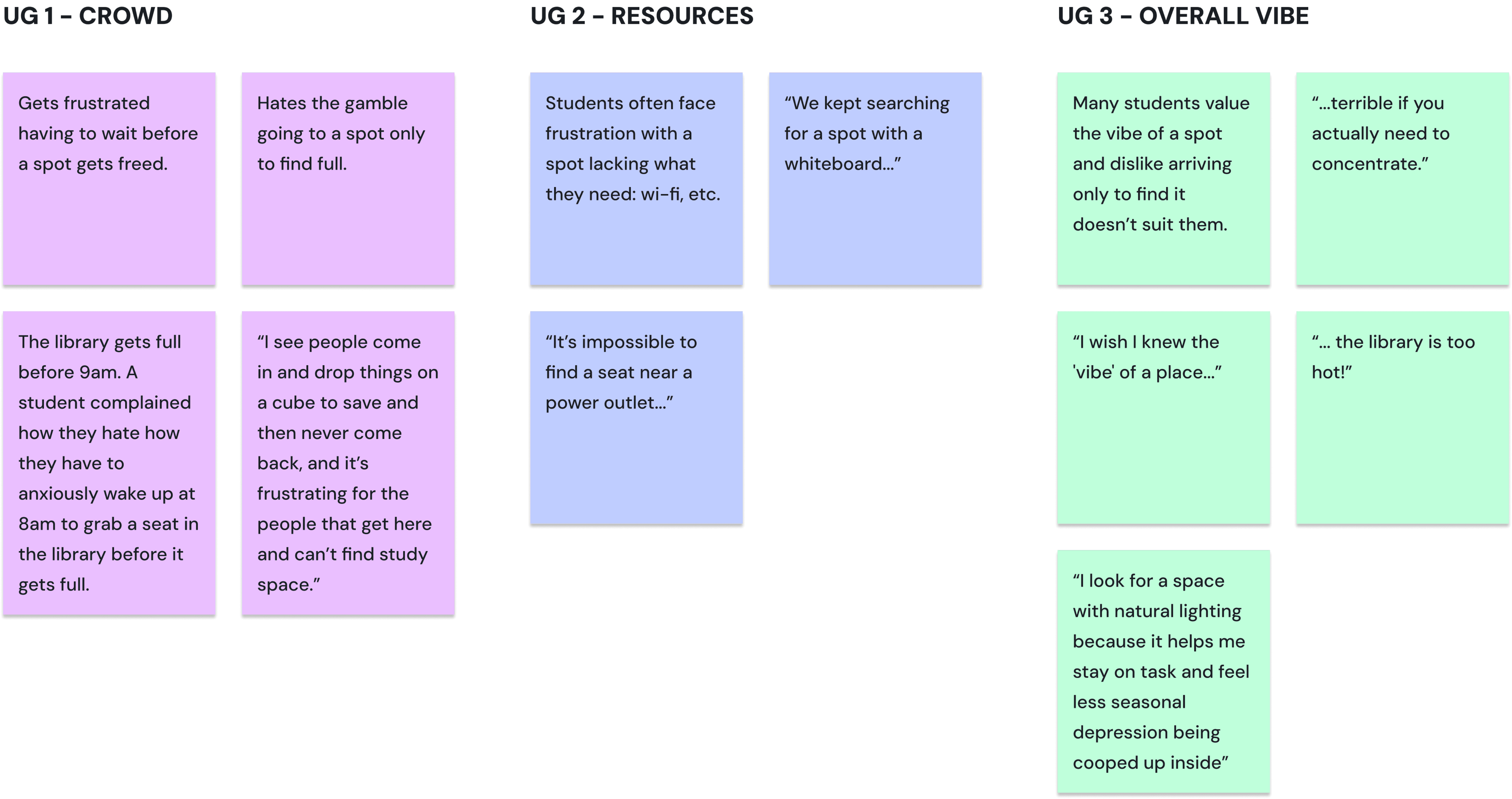 I organised findings into an affinity map across four themes: crowd, resources & overall vibe.