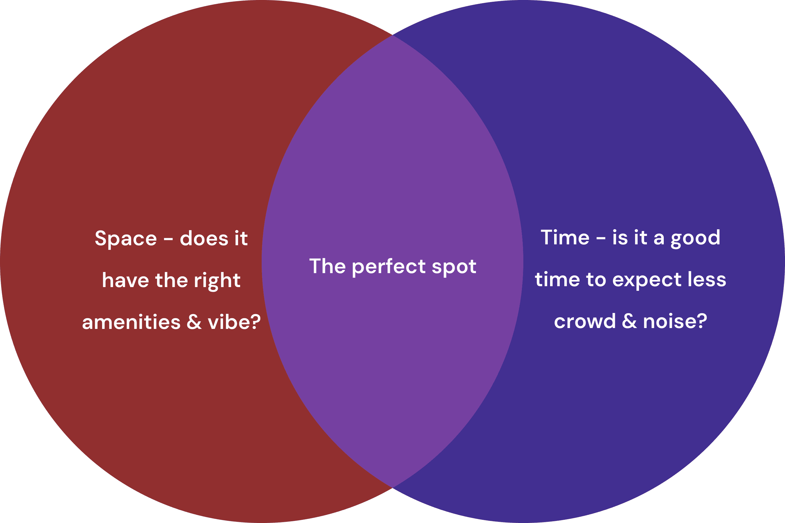 A day-by-day, hour-by-hour crowd chart so students can identify the quietest window for a spot they already like.