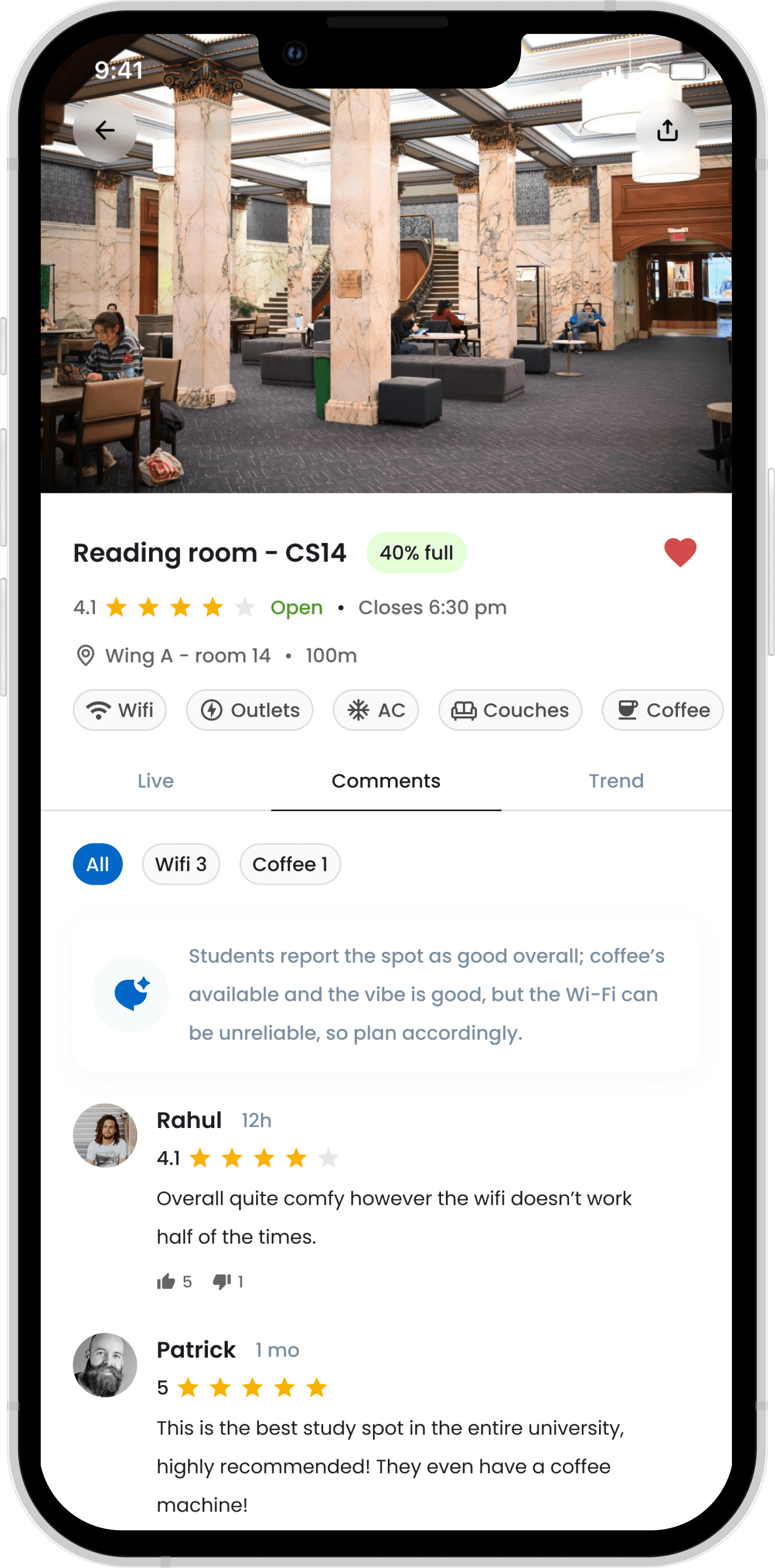 Each spot detail page leads with a real photo of the space so students can assess the vibe before they leave. Reviews are filterable so students can quickly find relevant comments (a "Wi-Fi 3" filter showing only reviews that mention Wi-Fi).