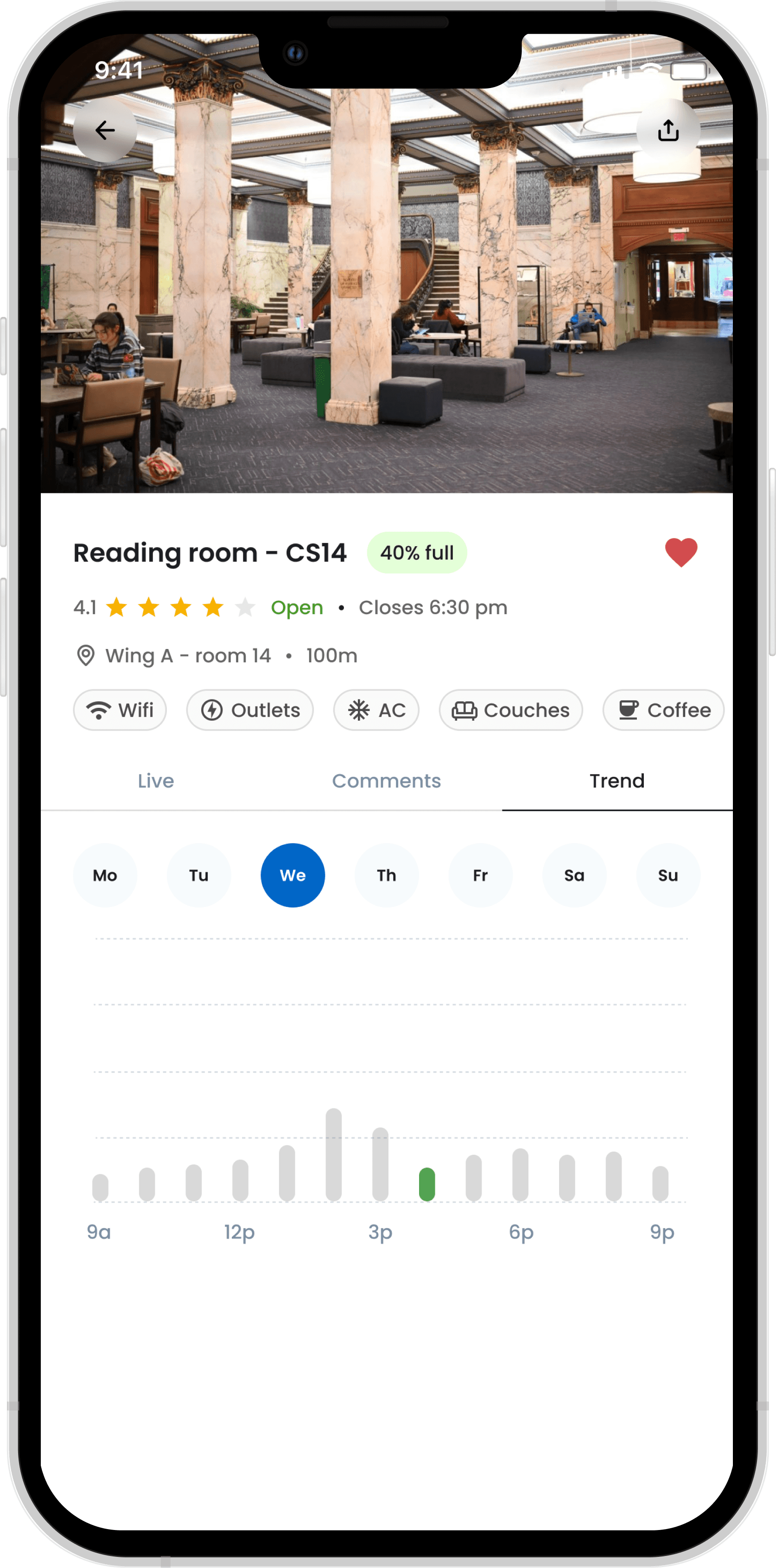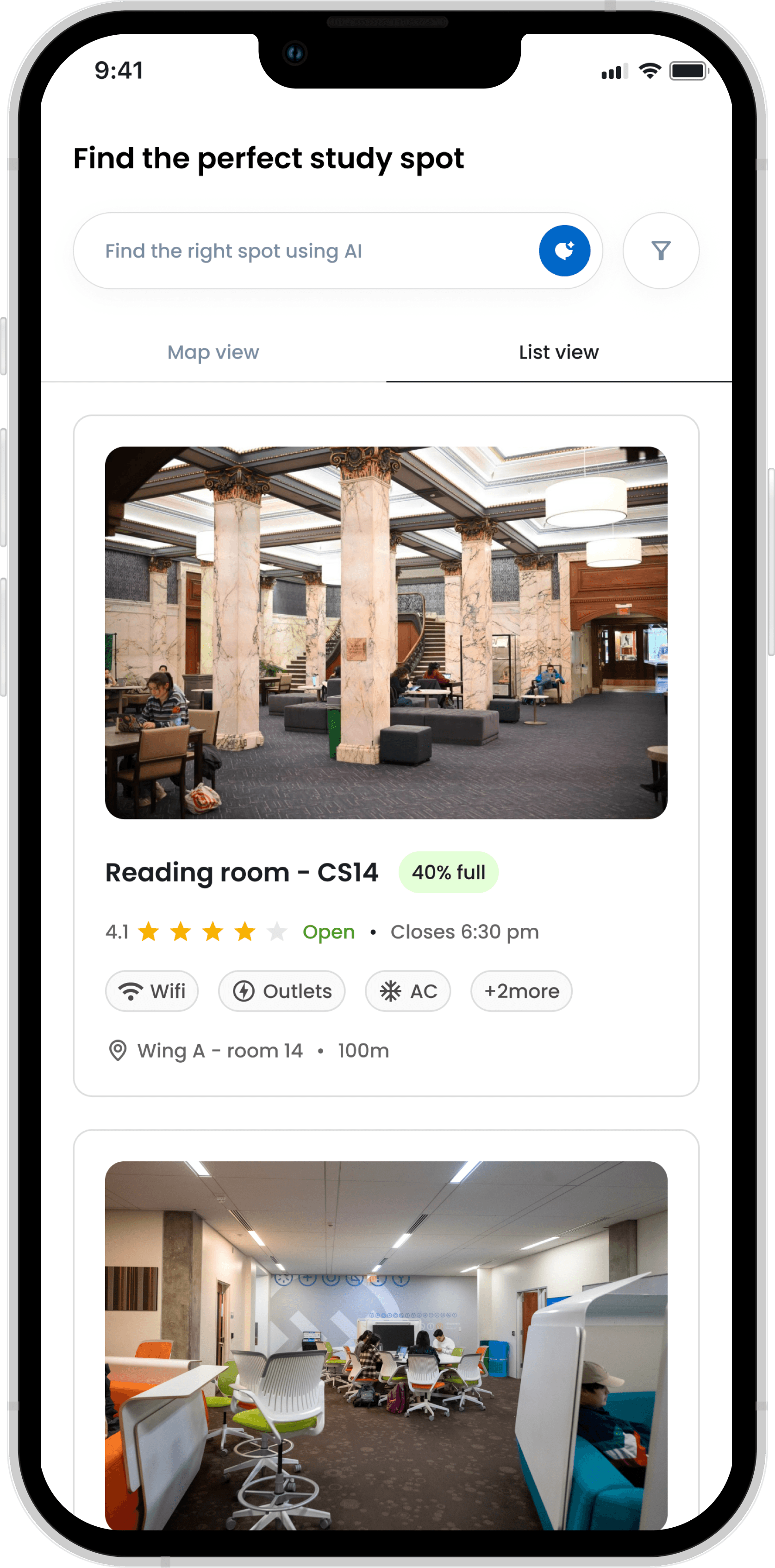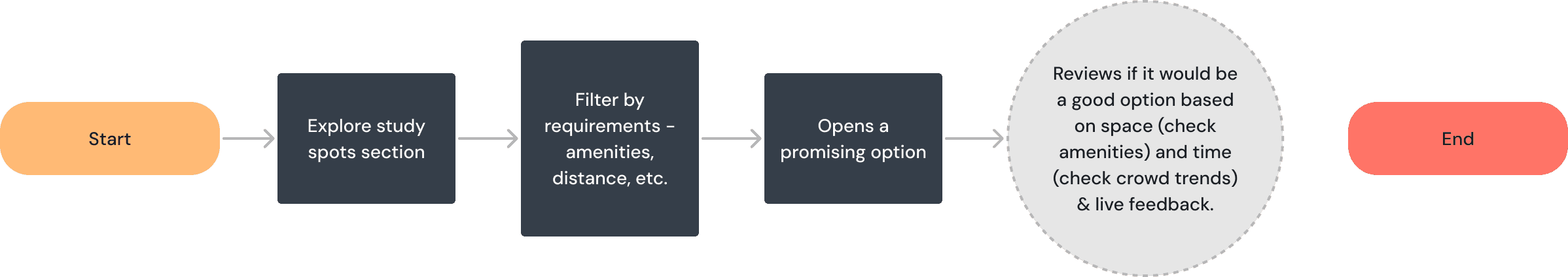 The end-to-end user flow which includes a student exploring spots and selecting the one that matches their needs based on crowd levels and amenities, etc.