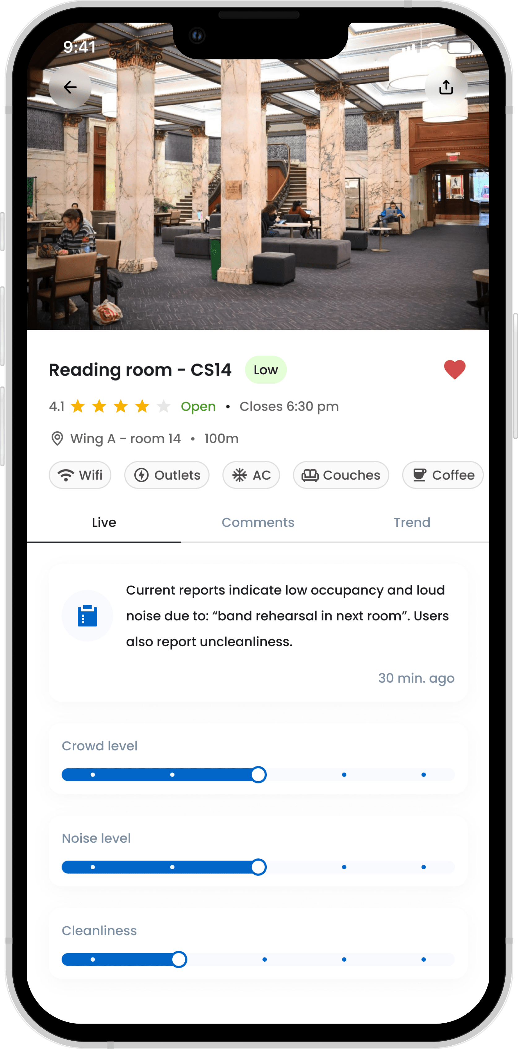 I pivoted the experience toward explorability instead of commitment, focusing on real-time insights like crowd levels, ambience, and available amenities.