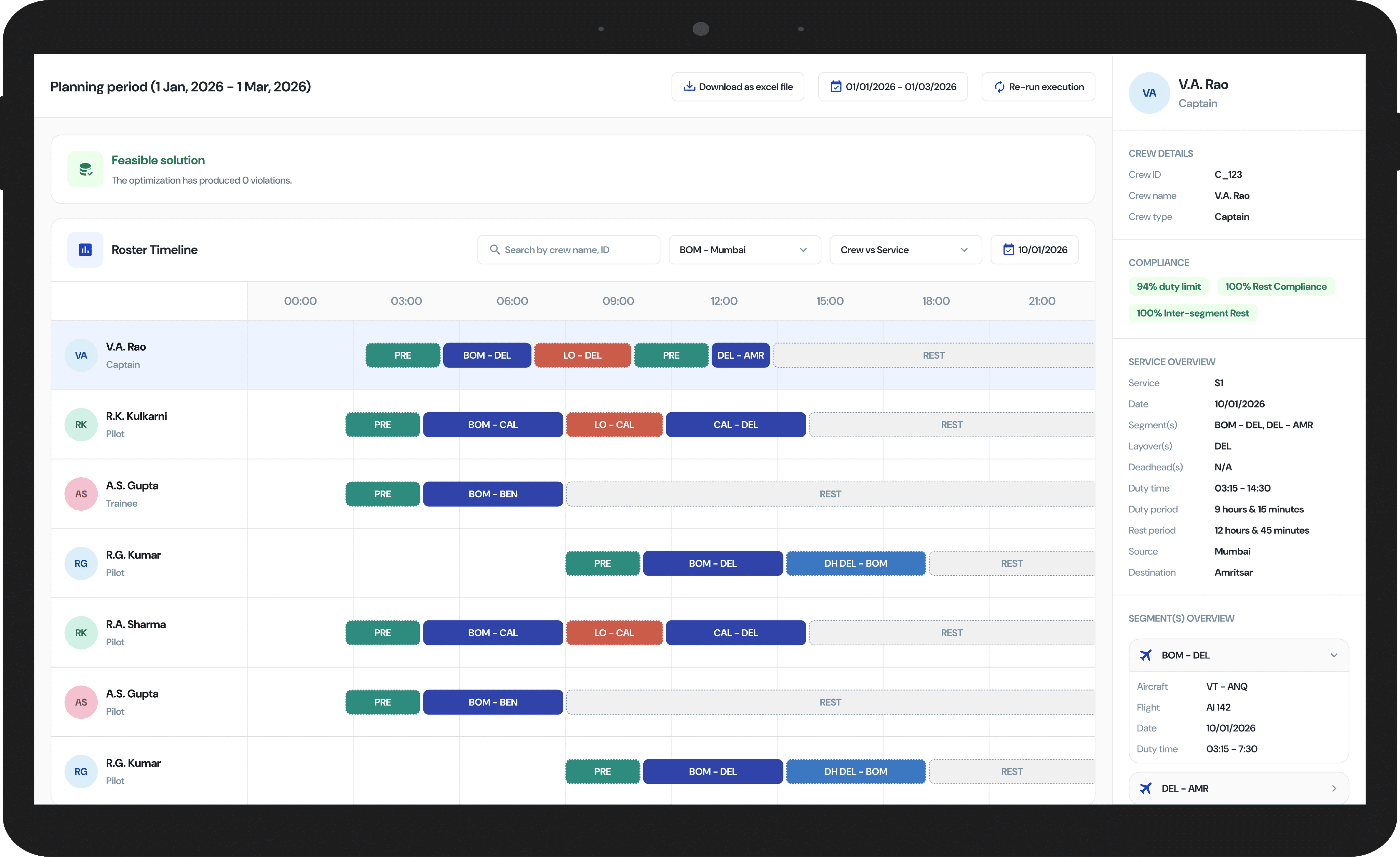 The execution page brings together the optimizer output, violations summary, suggestions to fix, and the Gantt chart with appropriate filters in a single cohesive view. Crew member details can be viewed upon clicking.
