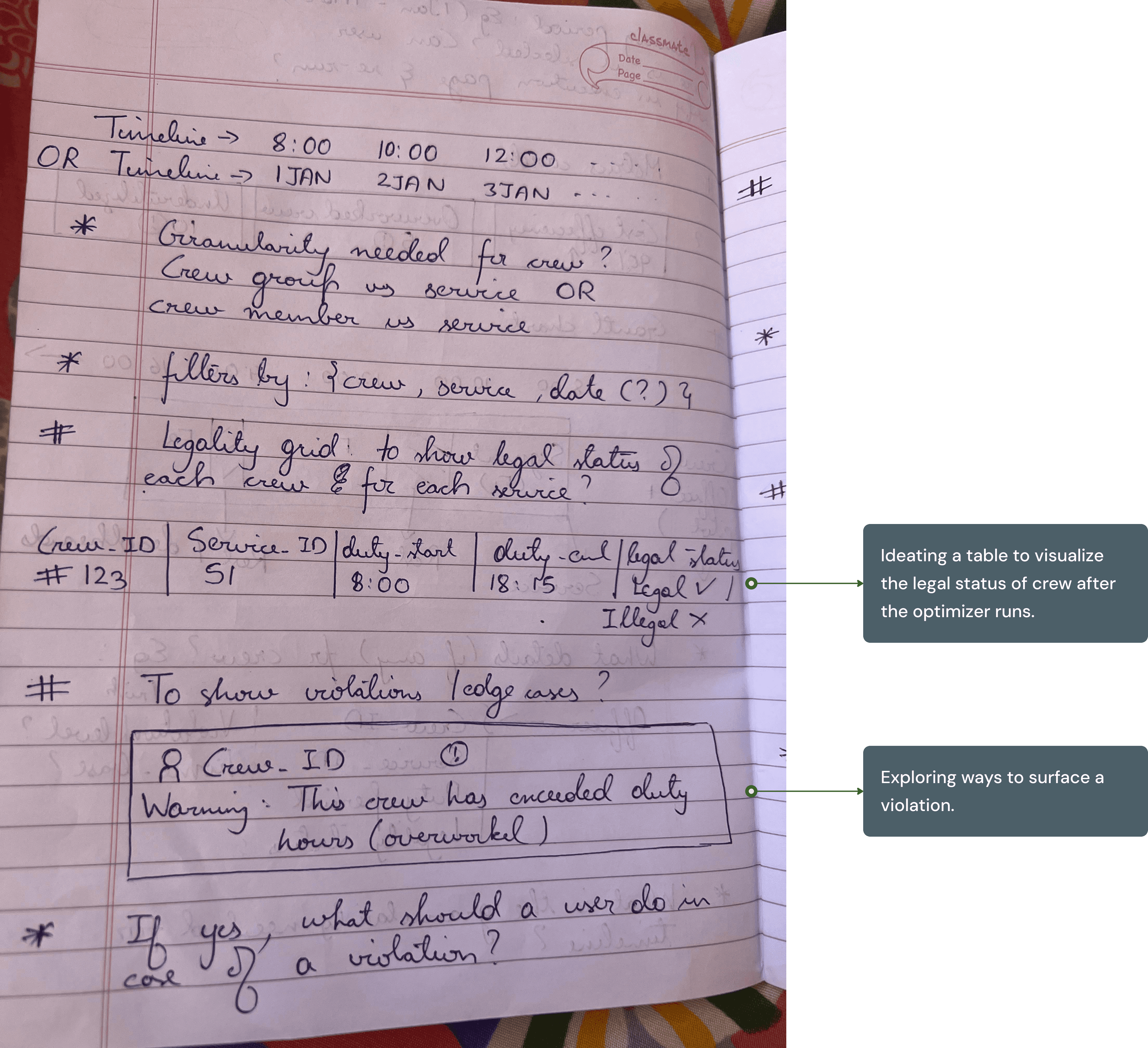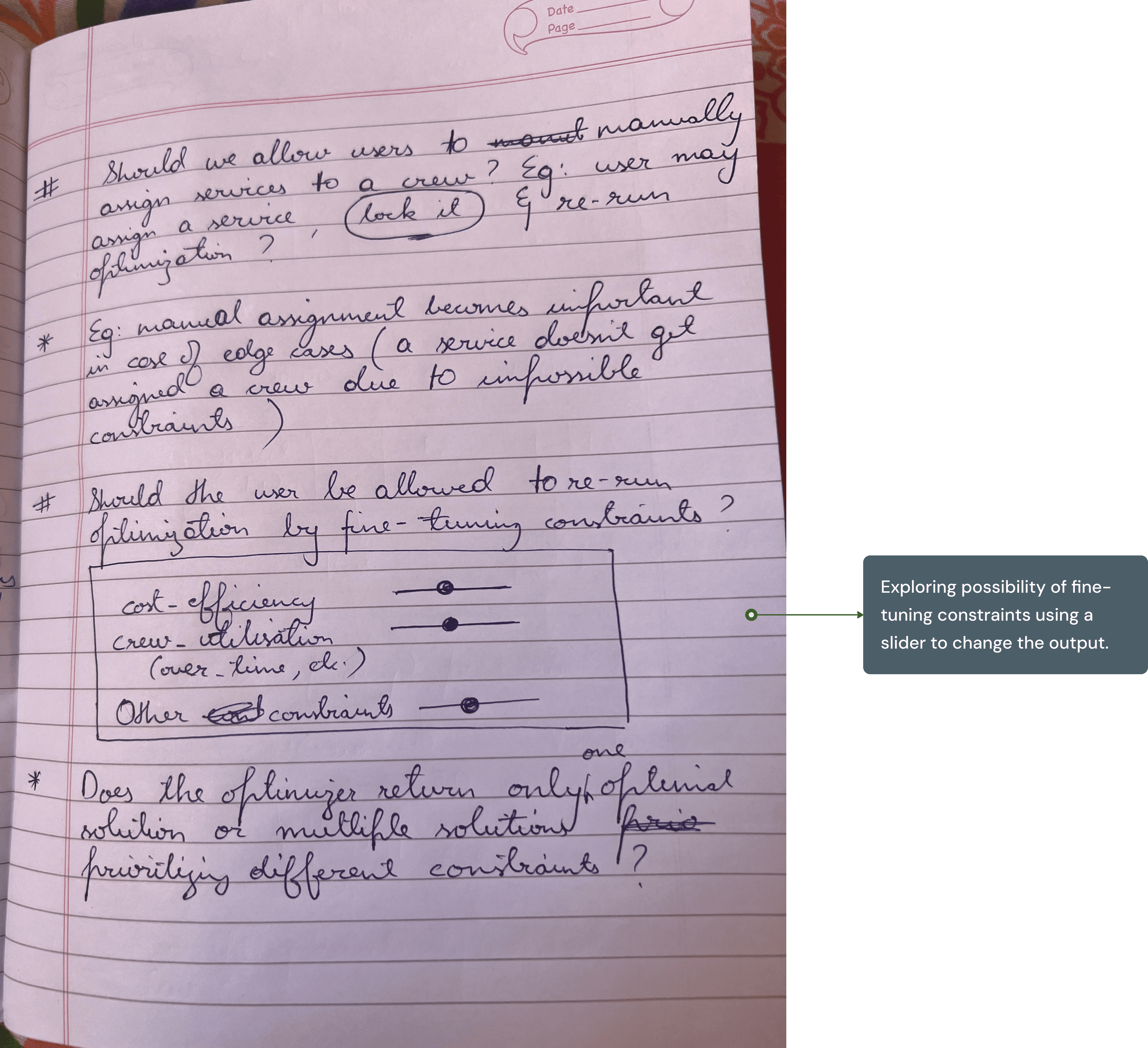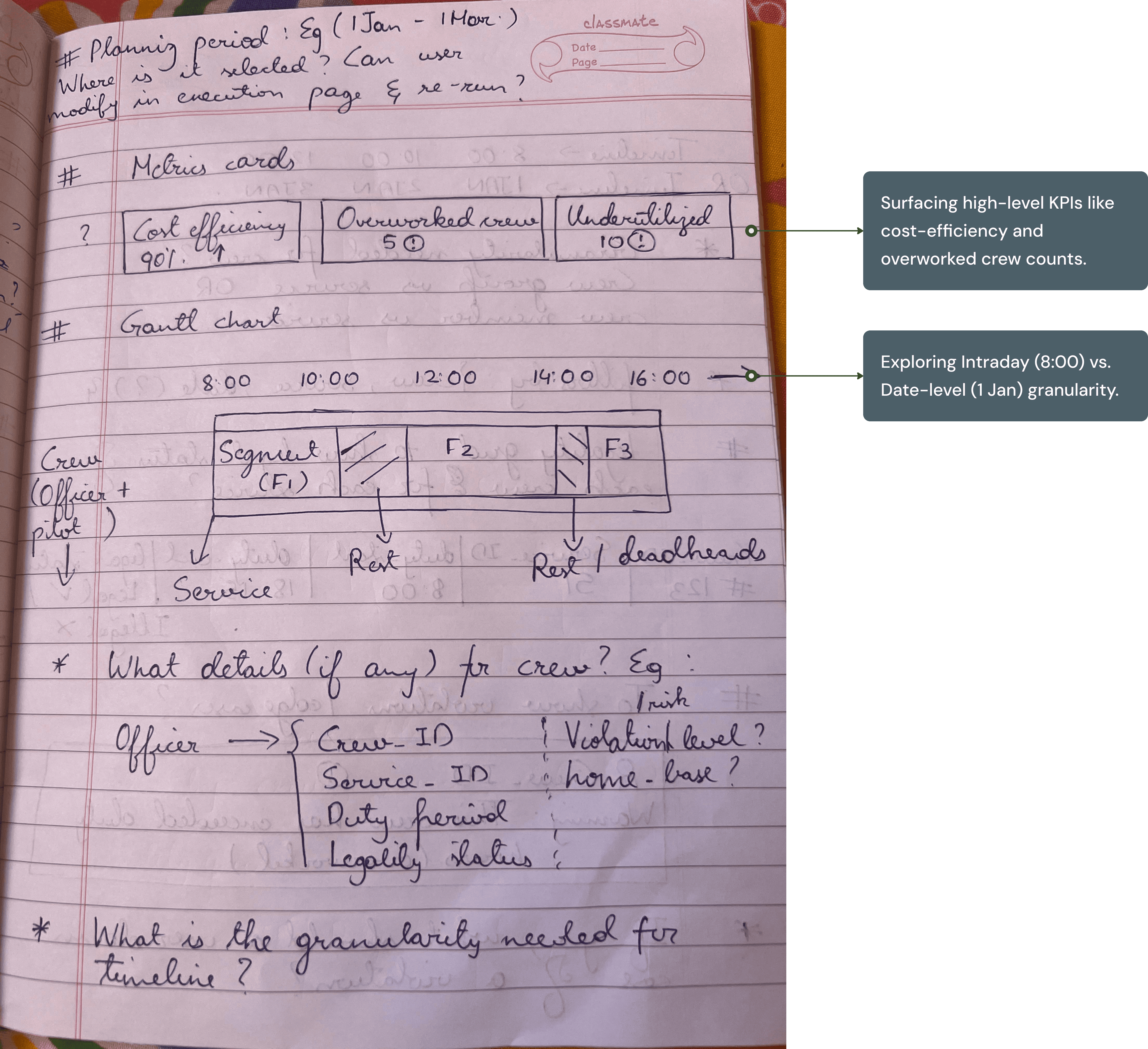 Before moving into high-fidelity designs, I did a deep dive into domain & used sketching to map out the core logic of the optimization interface. These early explorations focused on how to translate complex algorithmic outputs into a human-readable format.