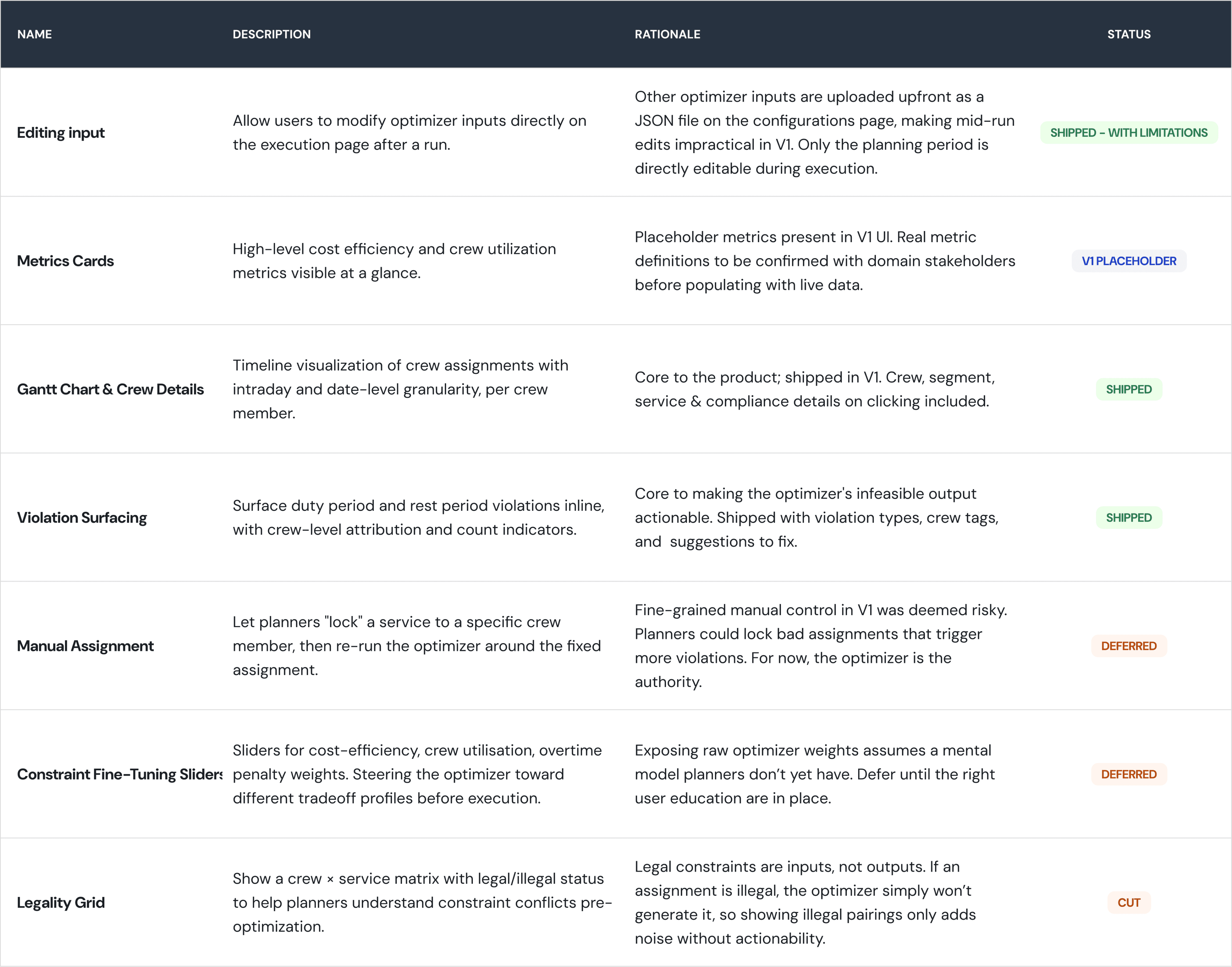 We explored allowing users to adjust priorities — cost-efficiency, crew utilisation (overtime etc.), and other soft constraints — using sliders, letting them steer the optimizer toward different tradeoffs before re-running.