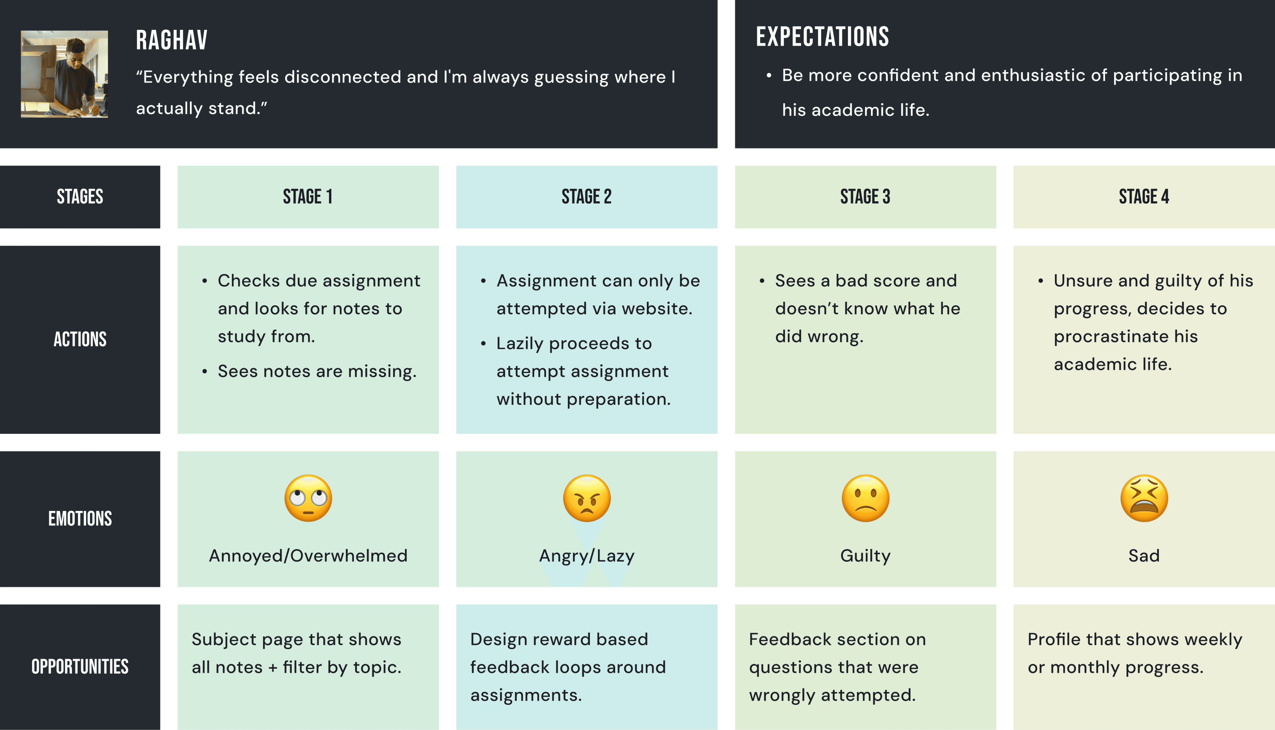 The mapping exercise identified opportunities to design a feedback system that: acknowledged their efforts, guided next steps & made them more confident of their academic life.